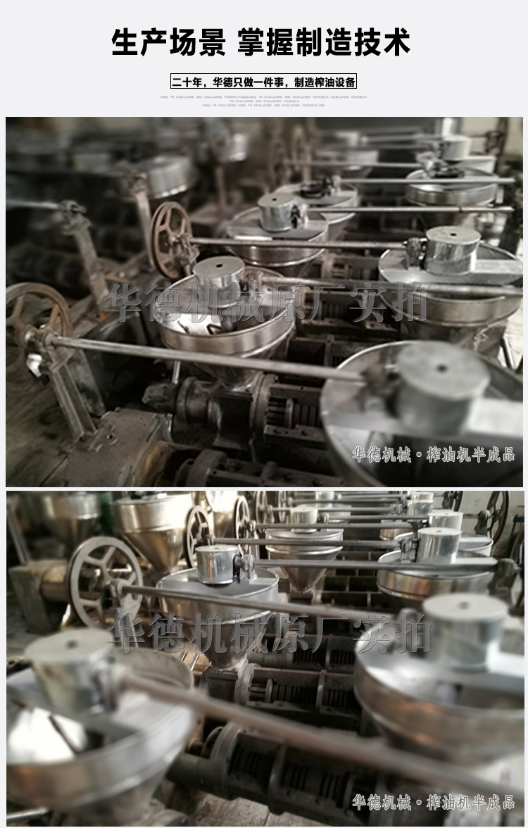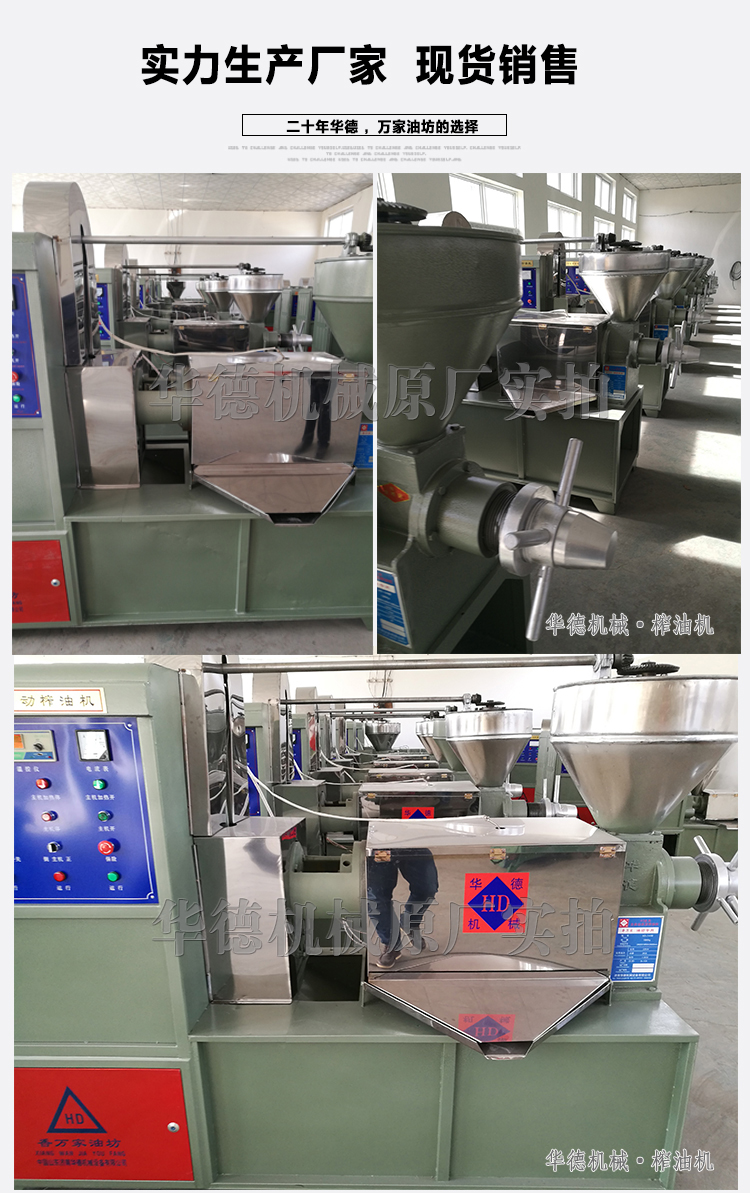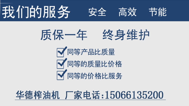 保證了最終榨螺的超耐磨性,廠家鄭重承諾,一副榨螺正常使用情況下壓榨40-60萬斤原料不用更換榨螺;2.電機:電機的性能直接影響整套榨油機動力,華德機械生產(chǎn)的每一臺榨油機設備,電機統(tǒng)一采用大廠全新CE認證銅芯電機,確保設備生產(chǎn)平穩(wěn)運行。華德機械在此聲明,如果發(fā)現(xiàn)我公司榨油機使用鋁芯電機,假一賠萬。 3.連接標準件:榨油機的各個部件主要靠一個個螺絲連接,華德榨油機采用大廠高強度螺栓,堅固牢靠。只有各個不起眼的小部件的優(yōu)良質量,才組成了華德榨油機鉆石一樣的質量。